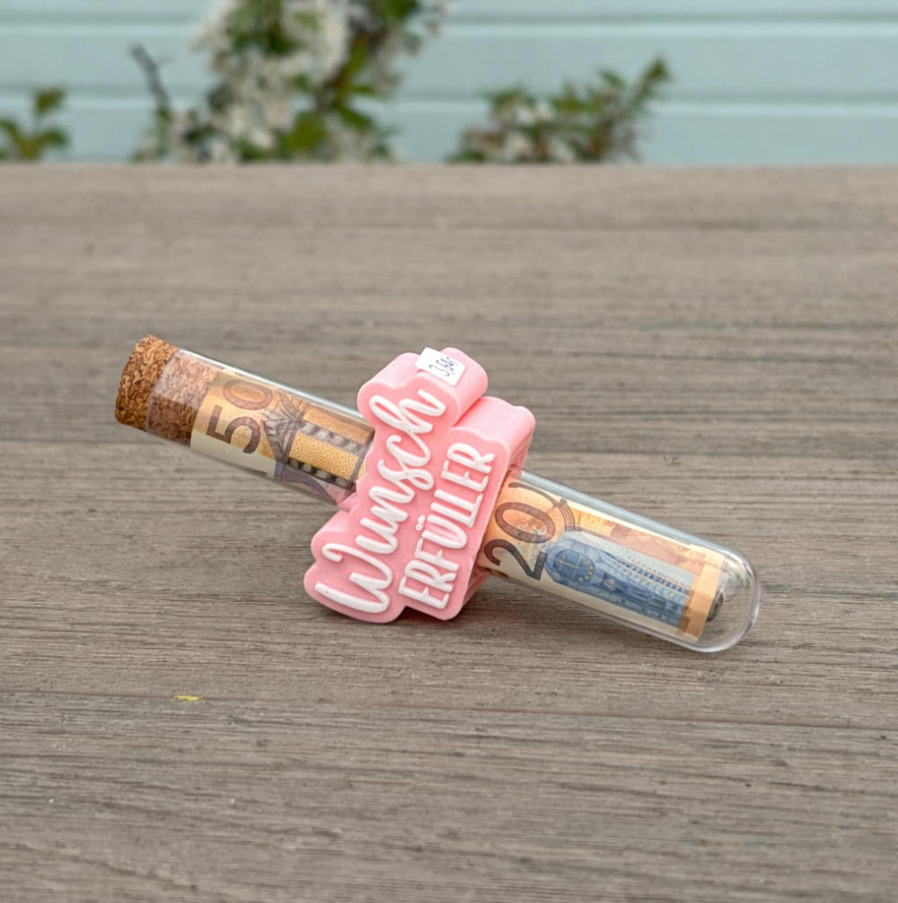 Dieses stilvolle Reagenzglas ist eine kreative und besondere Art, Geld zu verschenken. Verziert mit einem liebevollen „Wunsch Erfüller“-Clip in zartem Rosa, wird aus einem einfachen Geldgeschenk ein echter Hingucker.